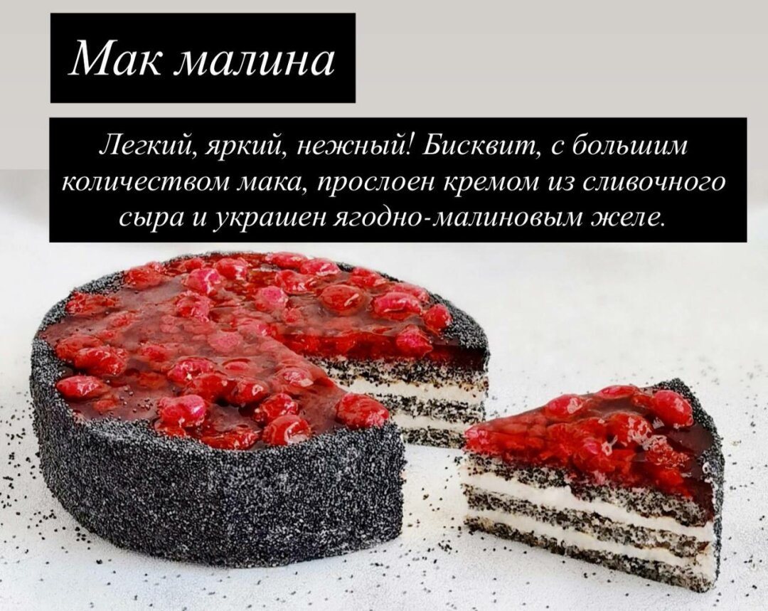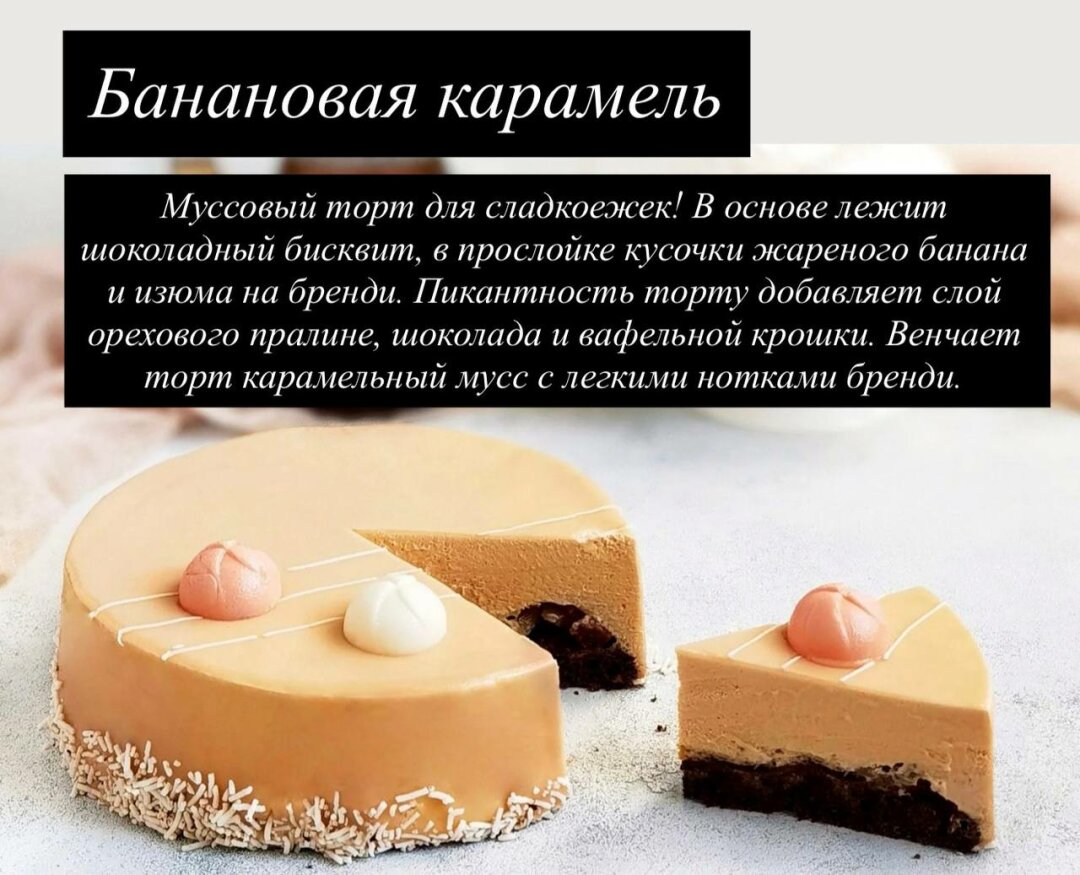 Для ценителей ягодных ноток 🍓 создан лёгкий и яркий «Мак-малина» — бисквит с маком в тандеме со сливочным сыром и малиновым желе. А поклонникам изысканной экзотики понравится муссовый торт «Банановая карамель» 🍌 с жареным бананом, изюмом на бренди, ореховым пралине и воздушным карамельным муссом.