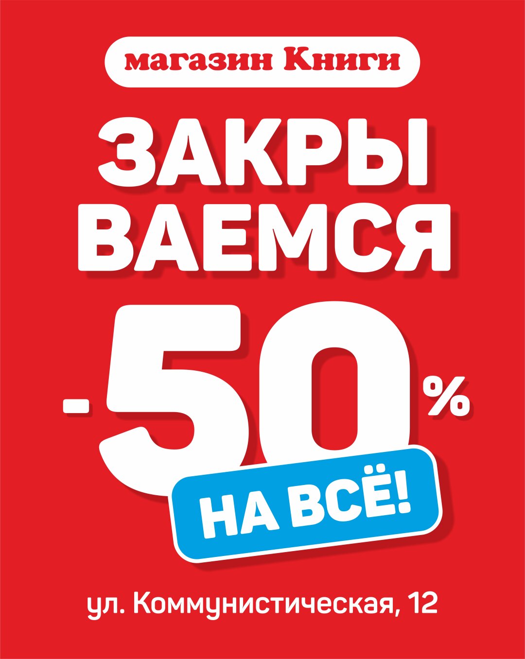 Магазин "КНИГИ" запускает финальную распродажу всего ассортимента. С 3 марта действует СКИДКА 50% на ВСЁ без исключений. Игрушки, коляски, велосипеды, мебель, канцтовары, книги и ещё много-много всего — всё можно приобрести в два раза дешевле.
