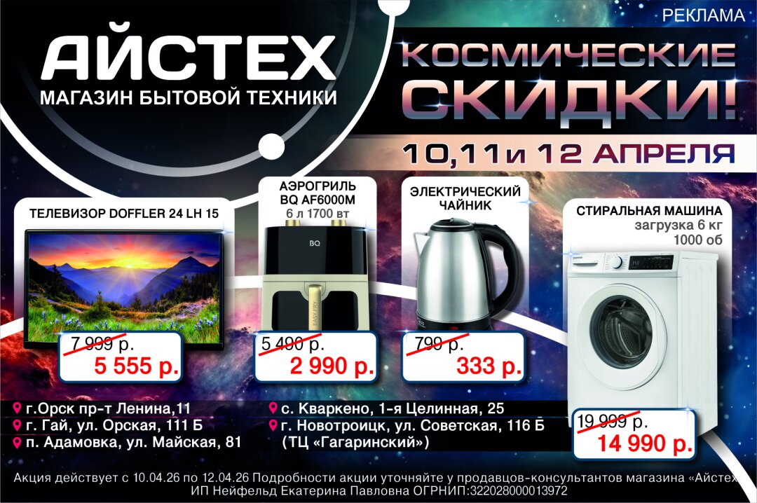 Жители Гая, готовьтесь к старту! С 10 по 12 апреля в нашем городе выпадает «звездный дождь» из выгодных предложений. Только три дня на технику действуют настоящие космические скидки до 50%.