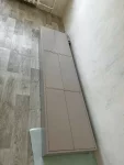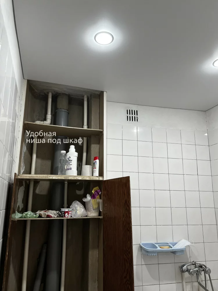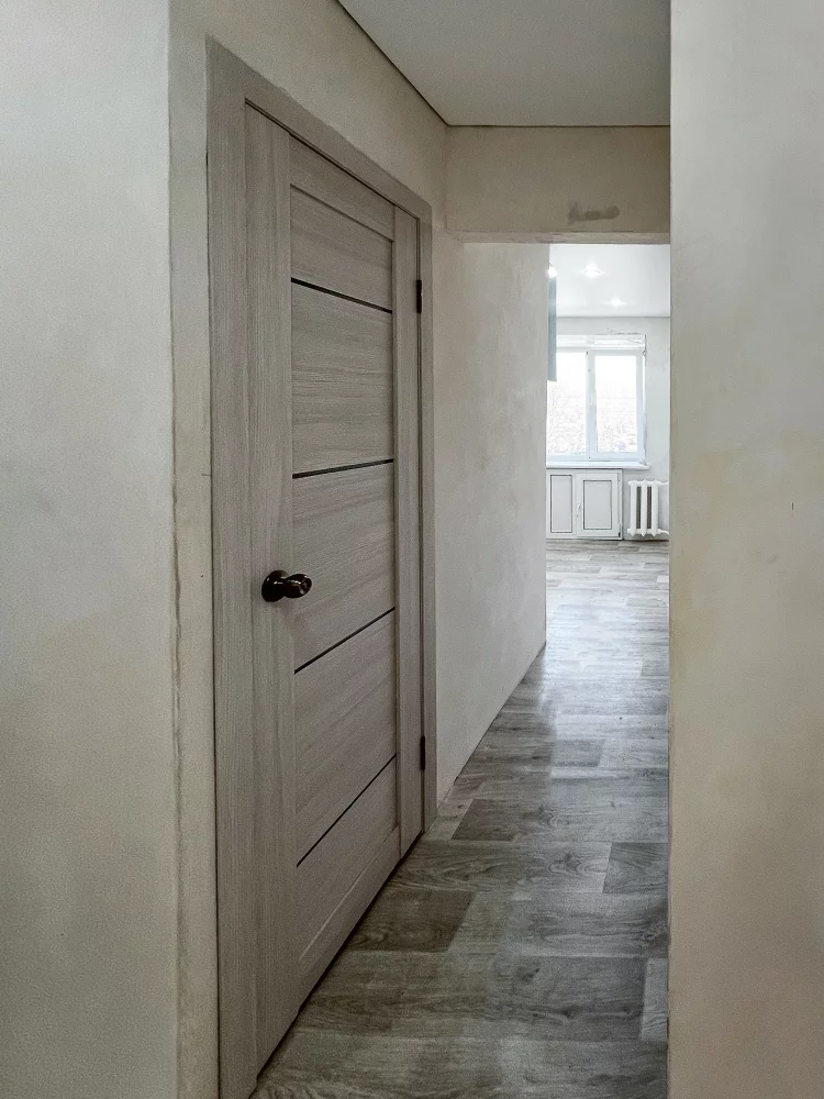 Установлены новые двери, натяжной потолок, выровнены и отштукатурены стены, куплен линолеум, а также куплены плинтуса на пол и потолок.