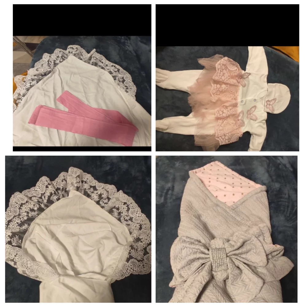 Отдам за шоколадку набор на выписку. Платье-боди, шапочка, уголок с вышивкой, серо-розовый плед и бант для пледа