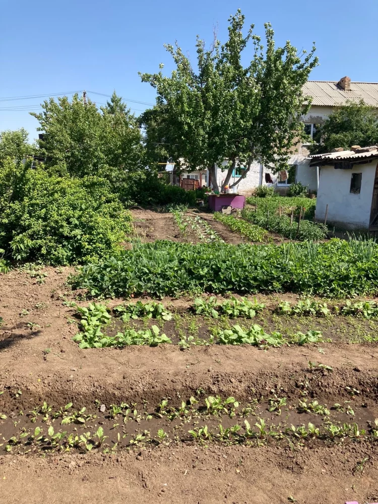 Ухоженный участок, на котором множество плодоносящих насаждений: вишня, черная и красная смородина, клубника, абрикосы, черемуха, яблоня, малина.