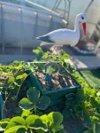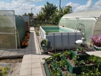 Имеются две большие теплицы из поликарбоната, в которых установлен капельный полив и умные розетки, с возможностью управления с телефона.