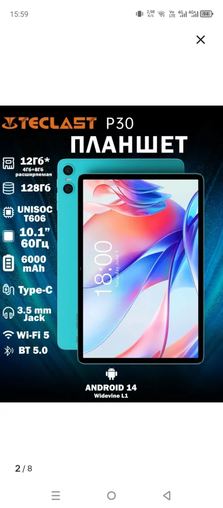 Продам Планшет андроид P30 4+8Gb/128Gb 10.1" Wi-Fi. В хорошем состоянии. Был куплен 30.09.25г. Пишете макс или имо.