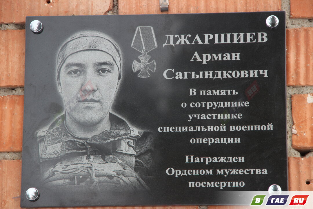 Мемориальная доска установлена погибшему участнику специальной военной операции Арману Сагындыковичу Джаршиеву на стене при входе в проходную Гайского ПНИ.