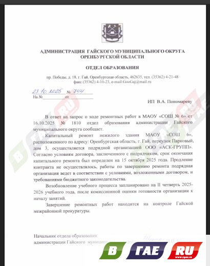 Ремонт школы №6 волнует учеников и их родителей. Осталось невыполненным обещание начать занятия в школе 1 сентября. Вот какую информацию предоставил отдел образования Гайского муниципального округа на 24 октября текущего года.