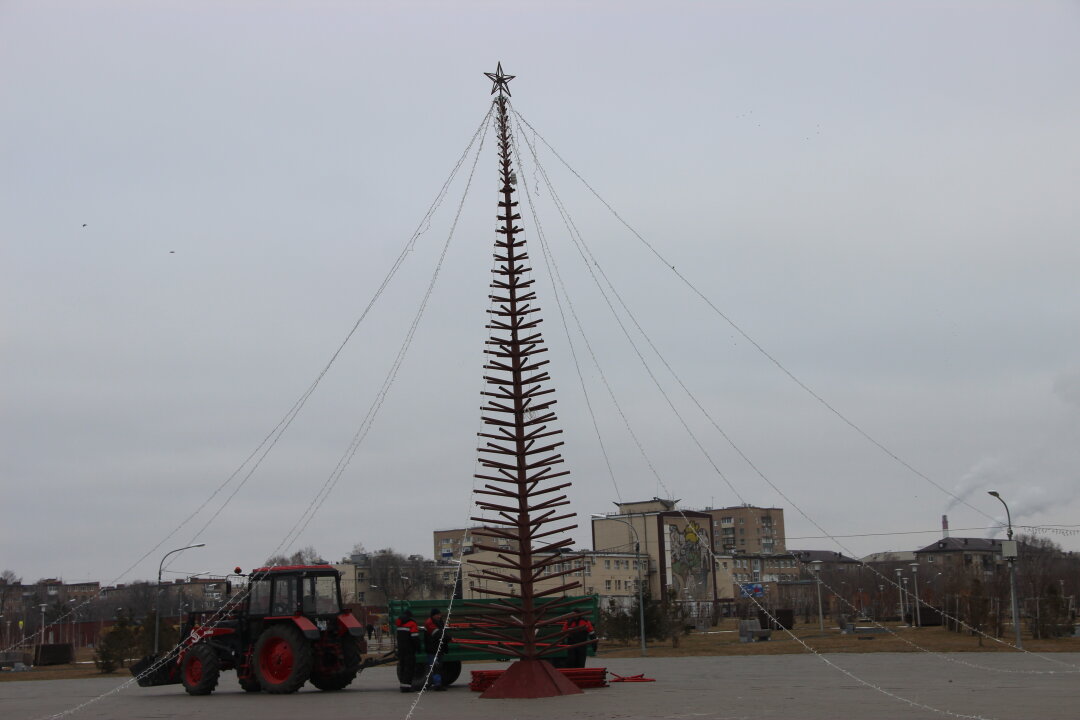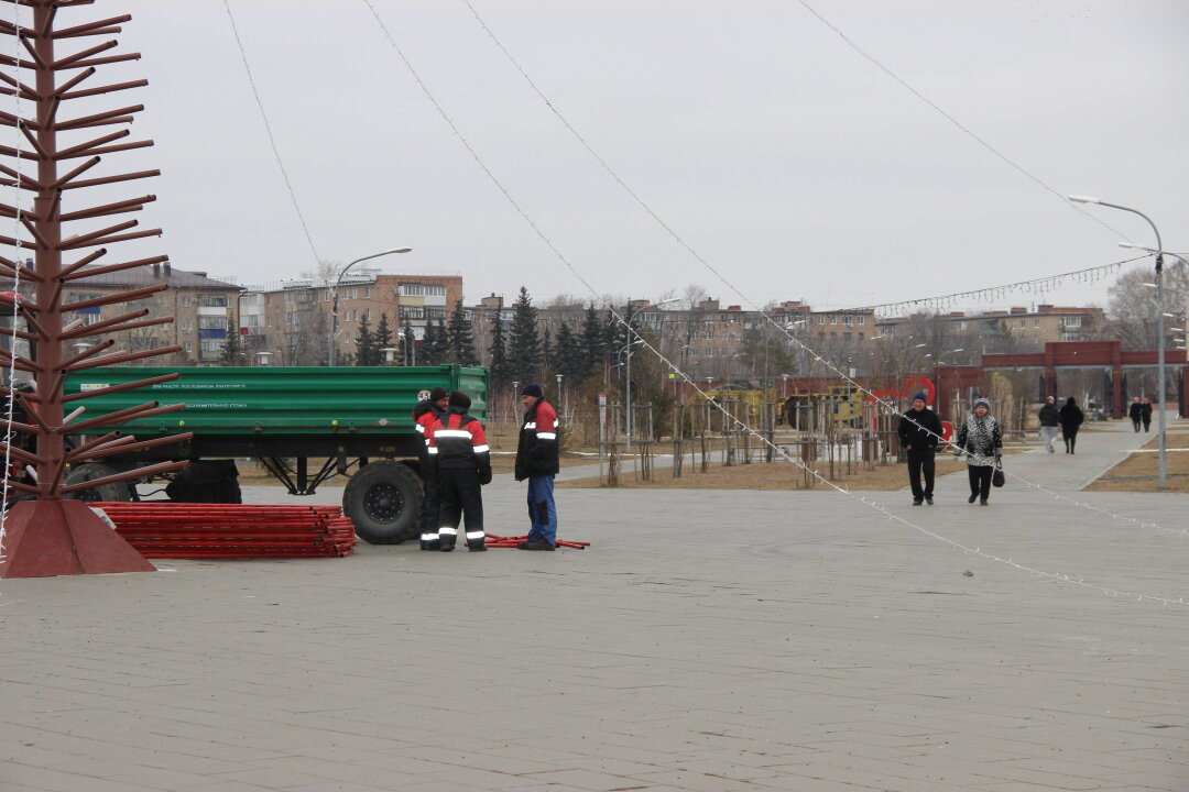 В Парке культуры и отдыха началась подготовка к Новому году. Вчера доставили, а сегодня уже подняли металлический остов будущей елки. Работает техника. Есть и первые "наблюдатели", которые смотрят, как готовят елку к празднику, поднимают нитки иллюминации.