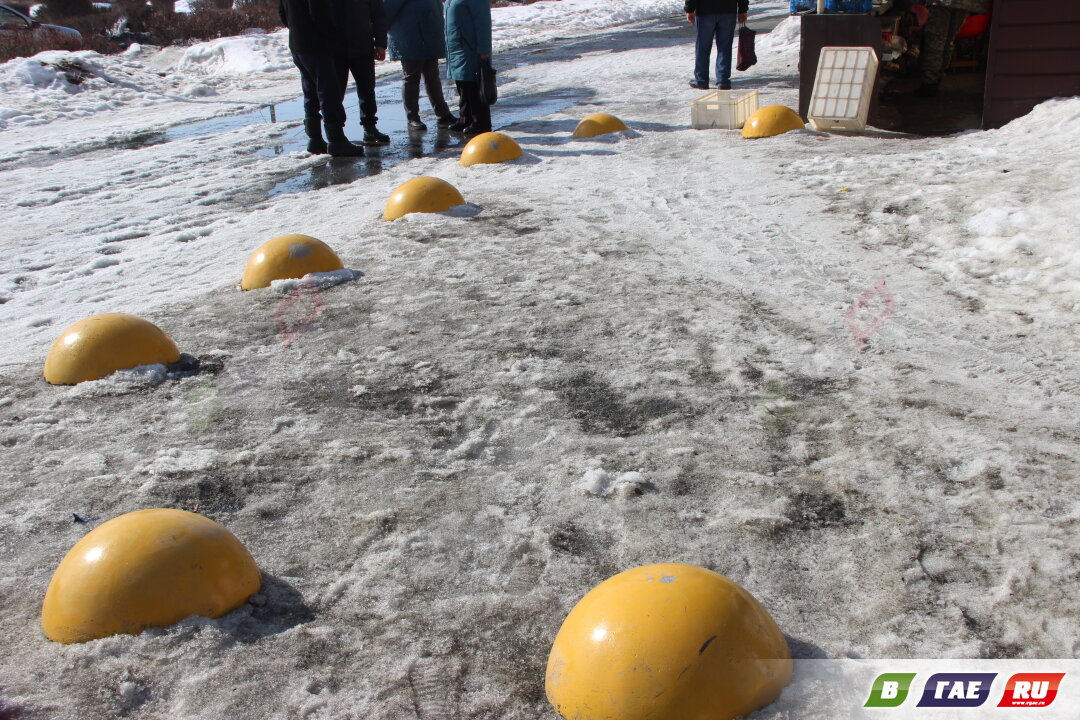 "Желтые бородавки" появились и на пятачке возле магазина напротив бывшей детской поликлиники. Оживленное пешеходное движение и вот те раз, бетонные полусферы. В метель, естественно, их покроет снегом. Как будут чистить тротуар?