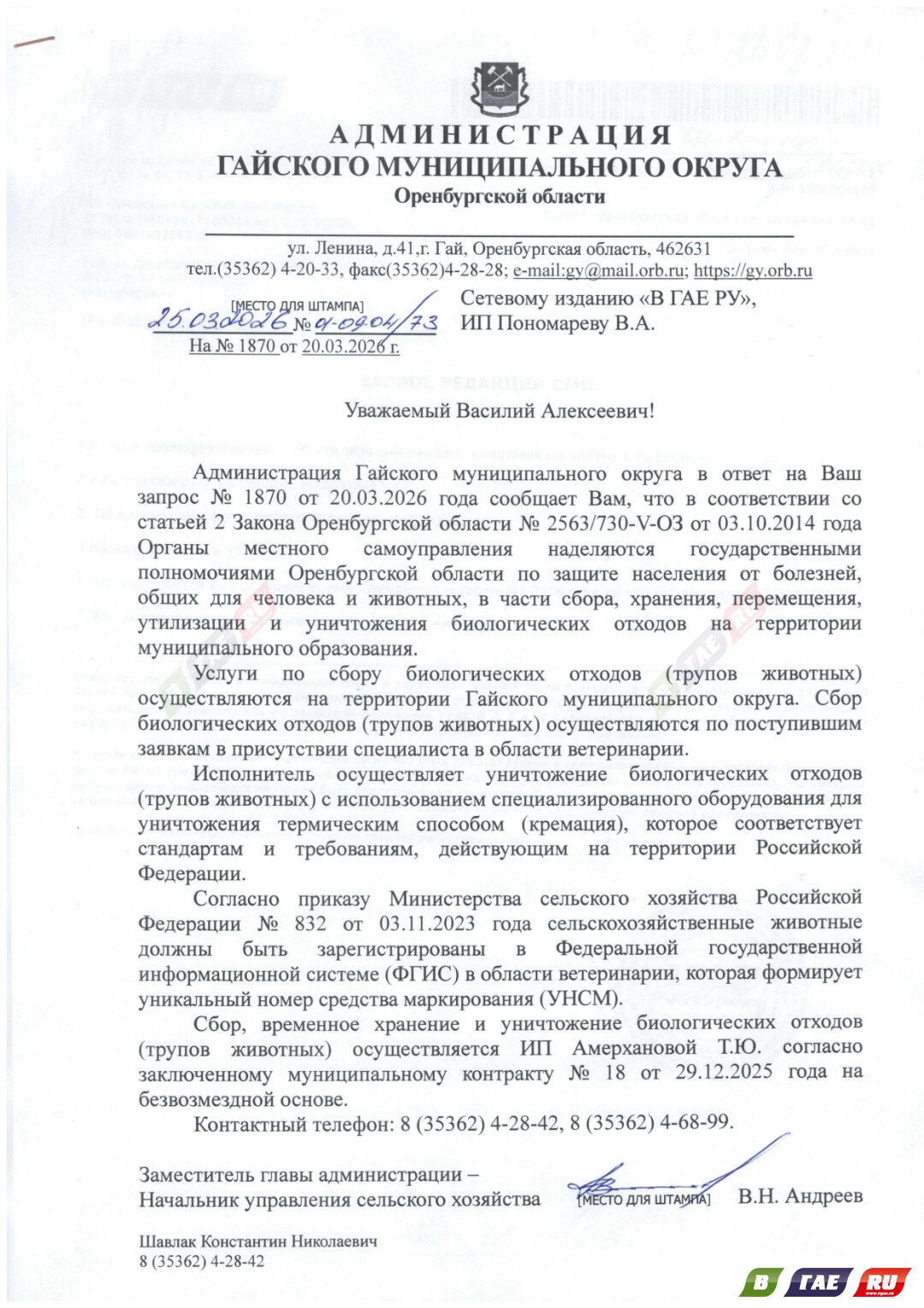 В администрацию Гайского муниципального округа был направлен официальный запрос. Заместитель главы администрации - Начальник управления сельского хозяйства В.Н. Андреев поделился полезной информацией и указал номера телефонов, по которым можно звонить в случае необходимости.
