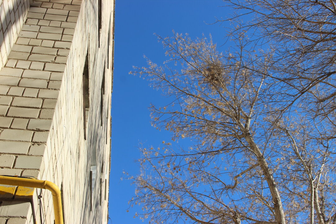 Поначалу птицы были замечены на детской площадке, в песочнице. Что-то рассматривали и искали. Позднее - старательно носили в клювах веточки и сухую траву. Место для гнезд они облюбовали на высоких деревьях возле пятиэтажки, напротив окон жильцов верхнего этажа.