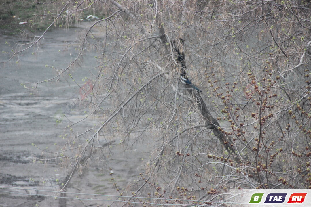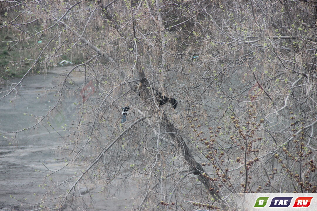 Кот забрался на высокое дерево. Помочь ему решила сорока. Она появилась ниоткуда и начала атаковать кота. Сорока прижималась к коту вплотную, "убеждала" его громким стрекотанием, пикировала на кота сверху, подбиралась по стволу снизу.