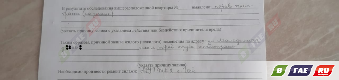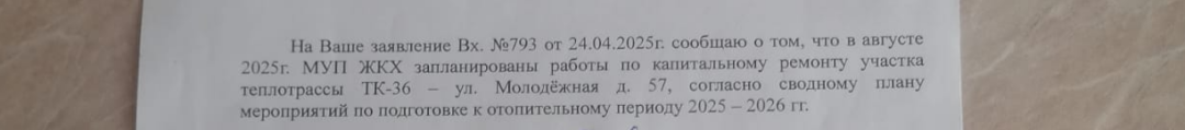 Квартиру затопило сильно. Приезжали специалисты, поставили бандаж, подкрепили обещанием, что в августе 2025 года предстоит ремонт участка теплотрассы ТК-36.