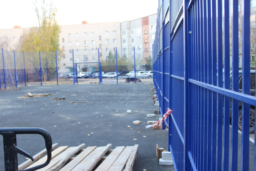 В объединенном дворе на пр.Победы,11 и 13 установили ограждение для мультиспортарены. Завезено необходимое спортивное оборудование, скоро за четырехметровым забором начнется его монтаж.