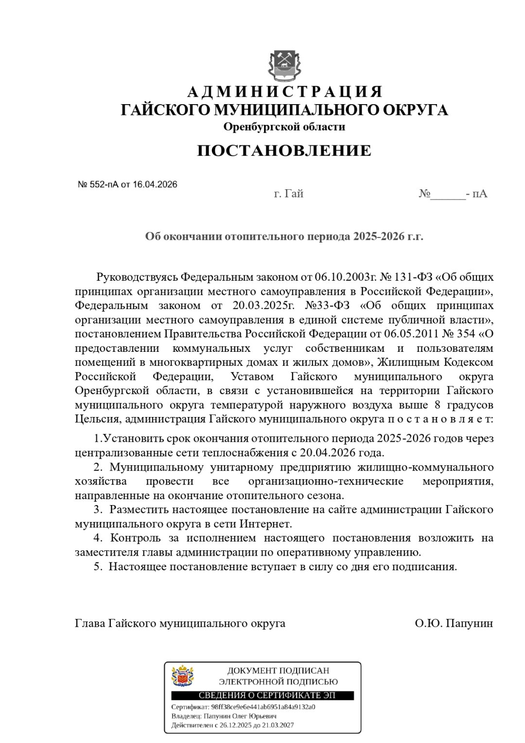 Стала известна дата окончания отопительного сезона 2025 -2026 г.г. через централизованные сети теплоснабжения - 20 апреля 2026 года.
