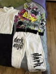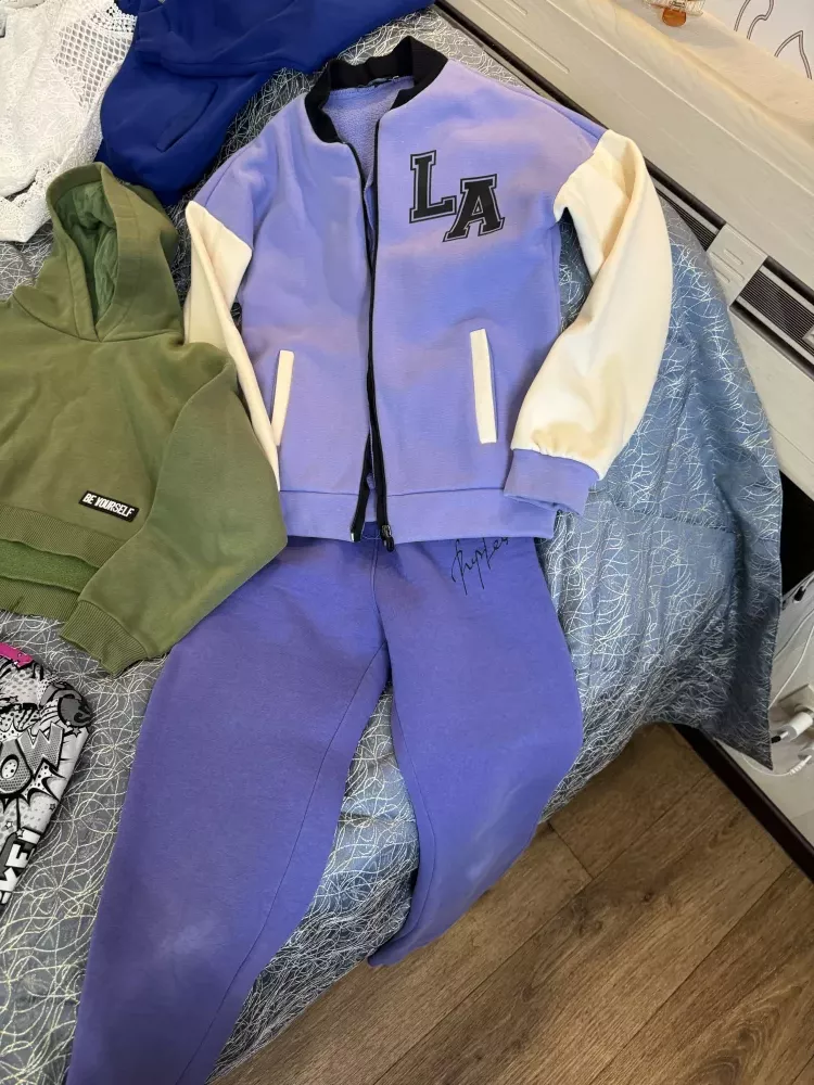 Джинсы и бомберы, теплый спортивный костюм- сиреневый.