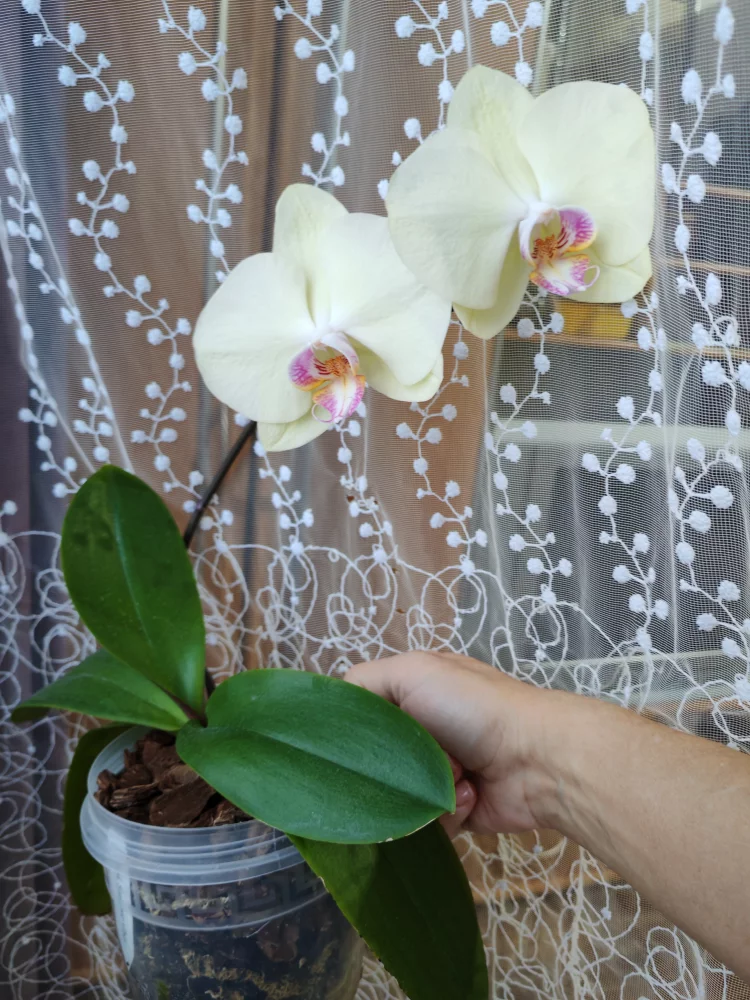Фаленопсис. Подросток. 2-е цветение. Цветы крупные сливочно-фисташкового цвета.