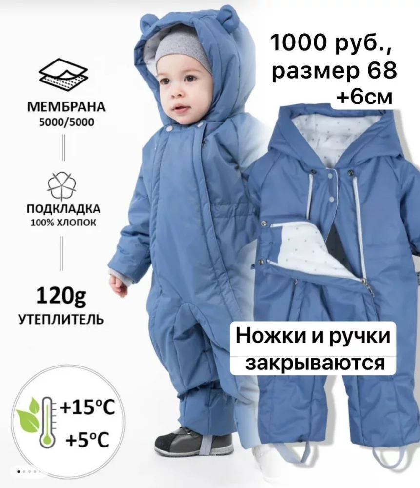 Комбинезон демисезонный мембрана, ножки и ручки закрываются, размер 68(+6см)-1000 рублей.
